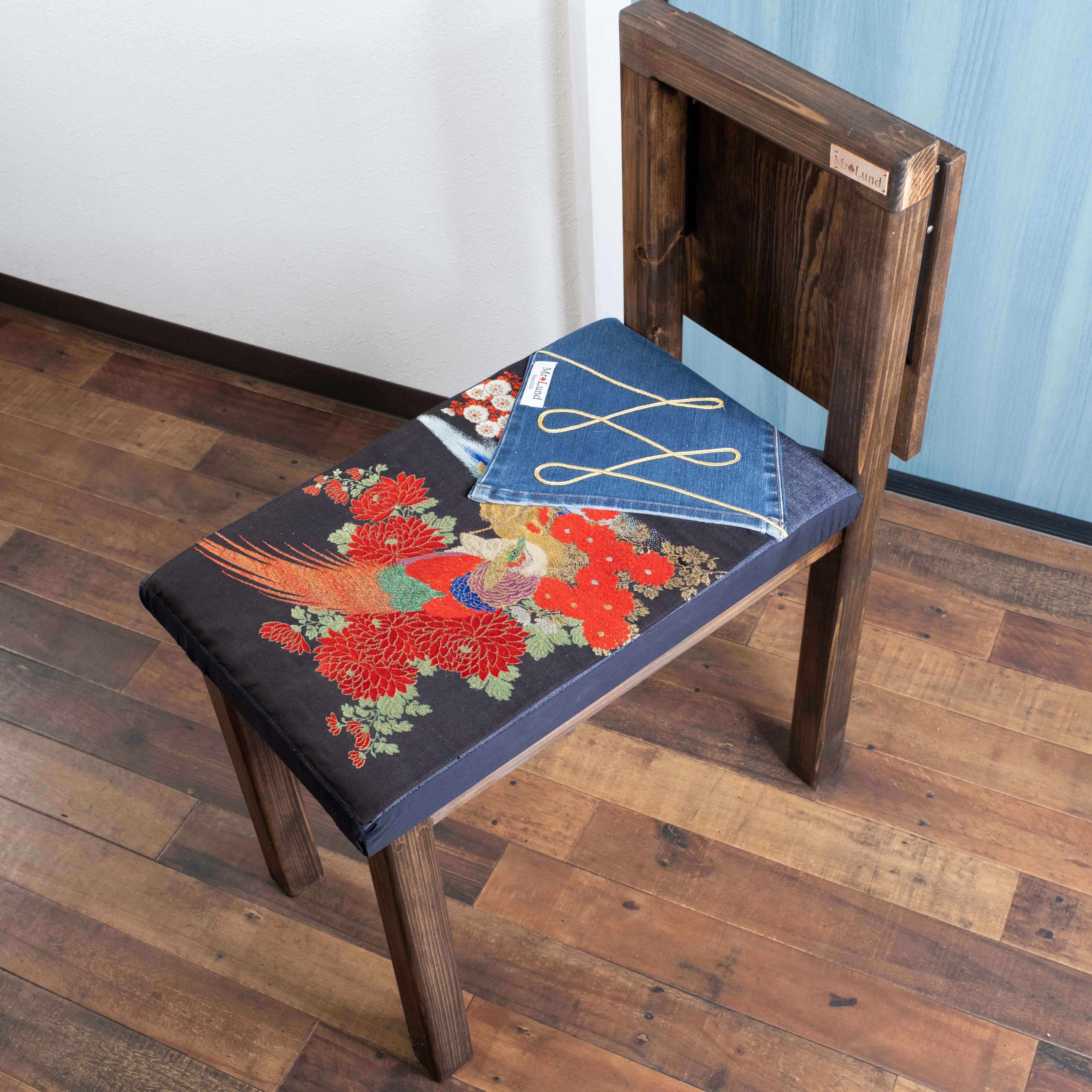 This original chair ”Princess KAGUYA ”features a beautiful and unique design that is crafted from materials such as HINOKI cypress, traditional Japanese obi belts, and denim.