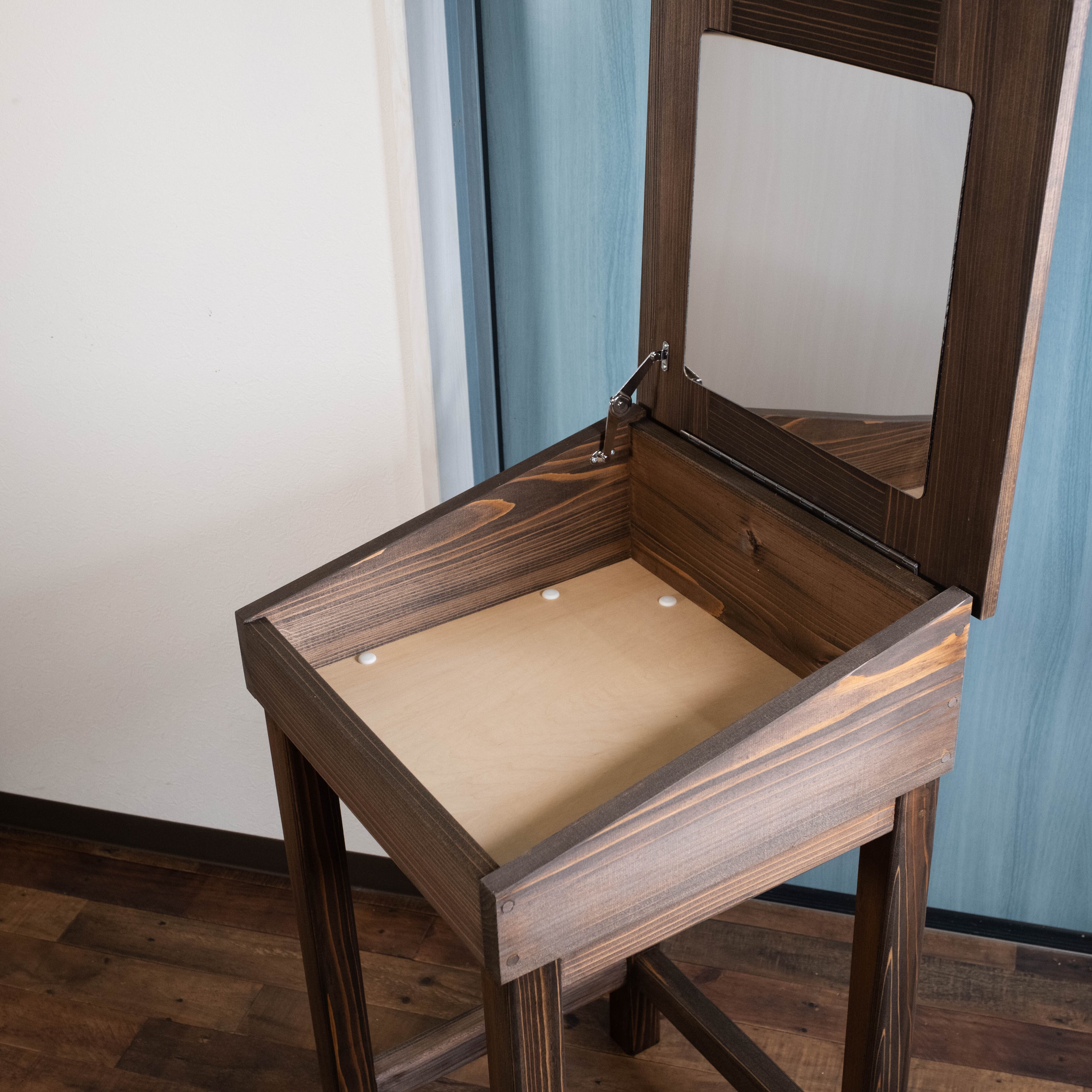 天板を上げると収納スペースがありすっきりと片付けることができる点も魅力的です。鏡も付いている為 化粧台としてプライベートな時間を大切に過ごす事も出来ます。